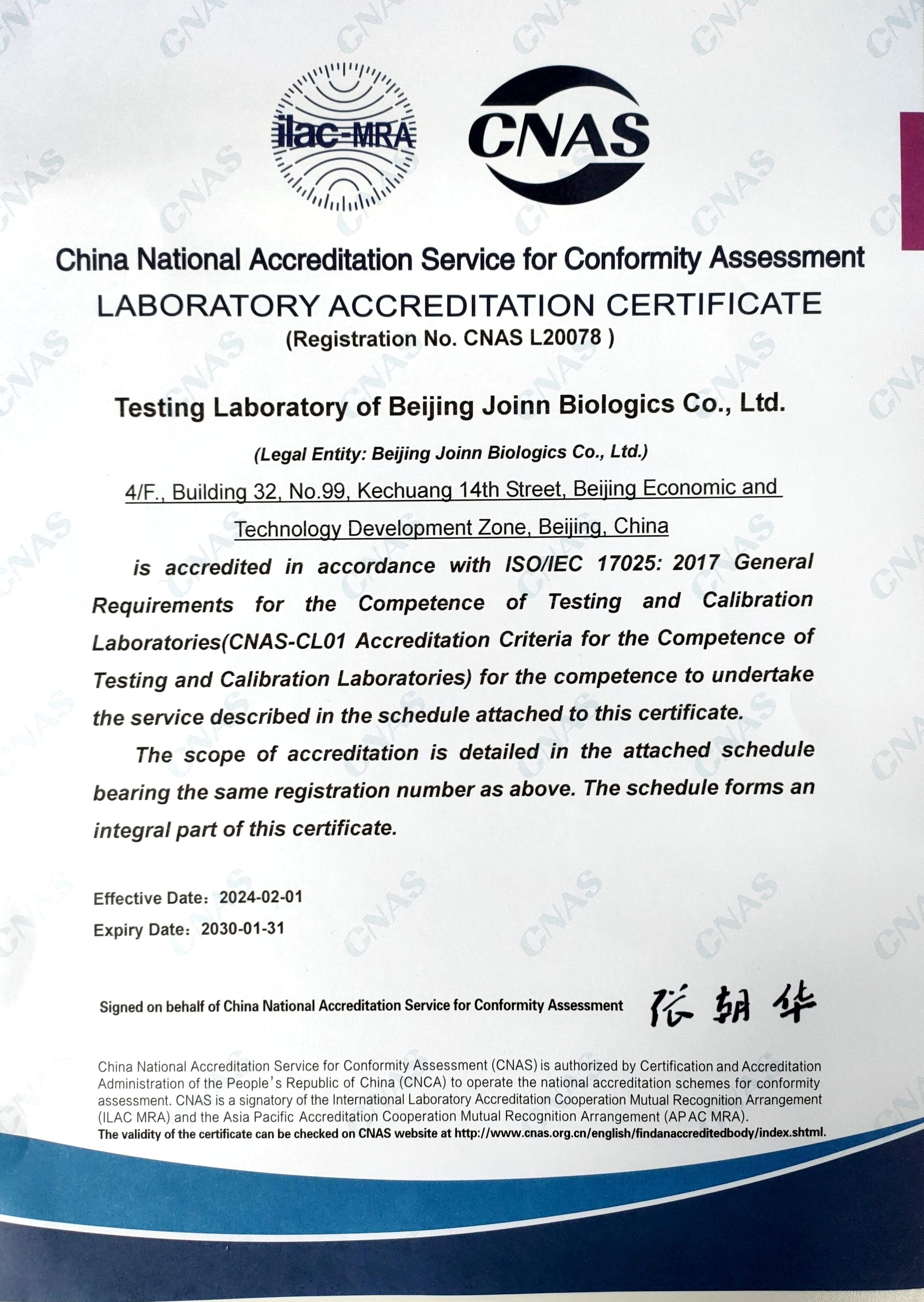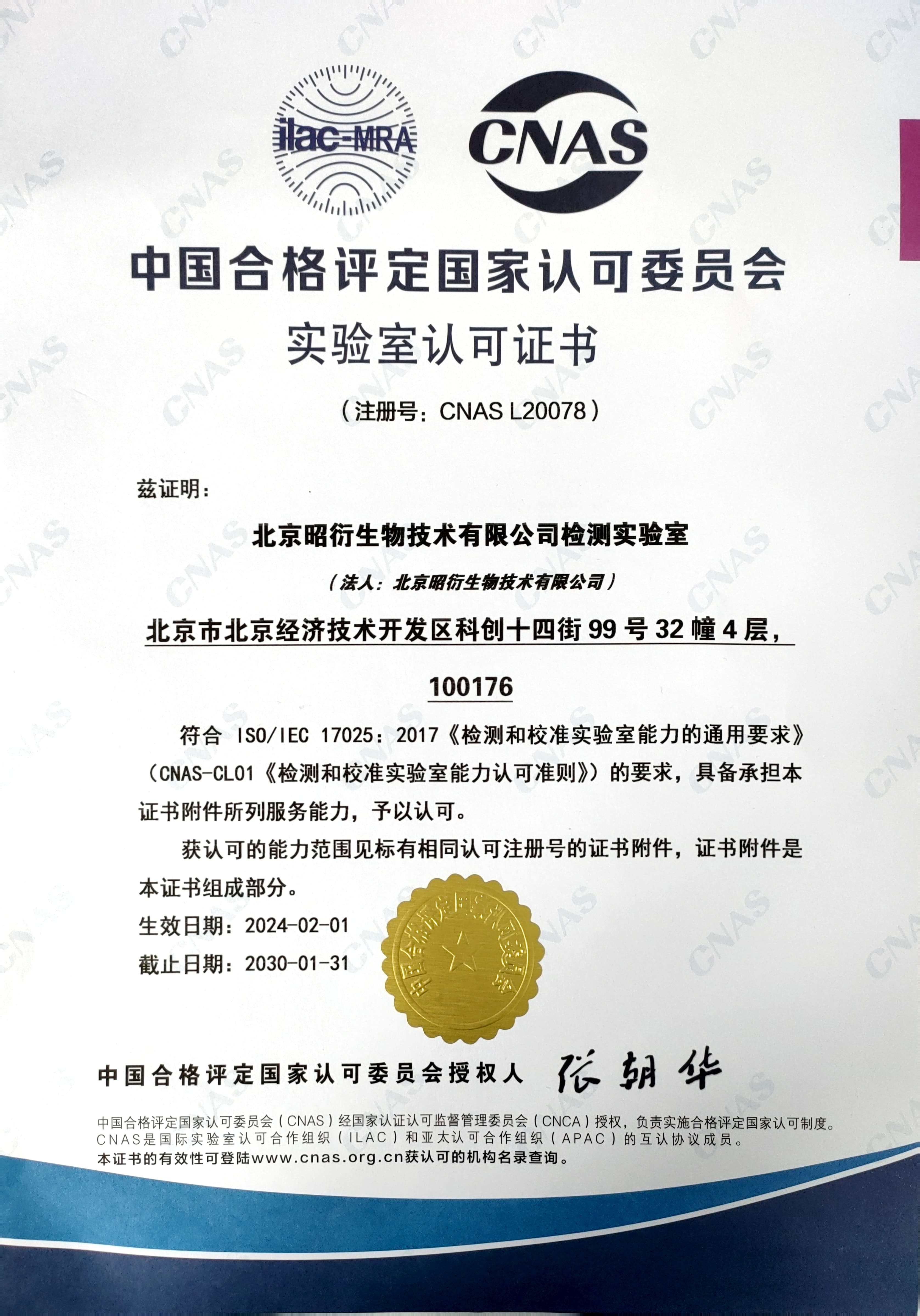 2024年2月,北京昭衍生物技術有限公司(下簡稱“昭衍生物”)分析檢測服務平臺建設運行的檢測實驗室順利通過中國合格評定國家認可委員會(CNAS)的評審,榮獲CNAS實驗室認可證書(注冊號:CNAS L20078),躋身國家認可實驗室行列。
